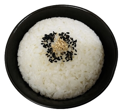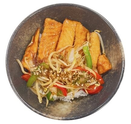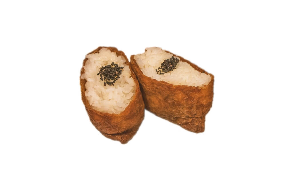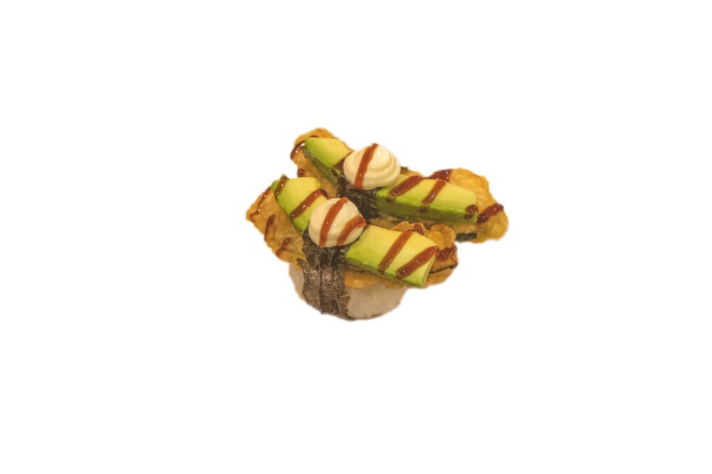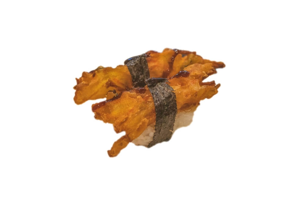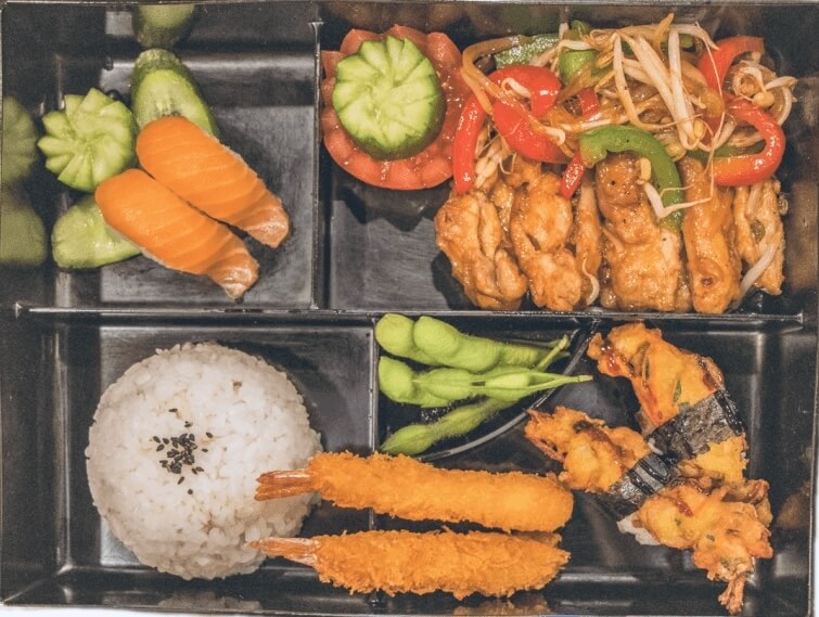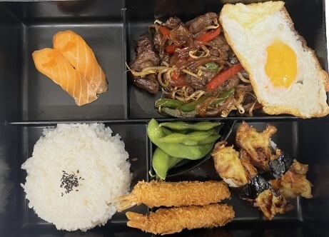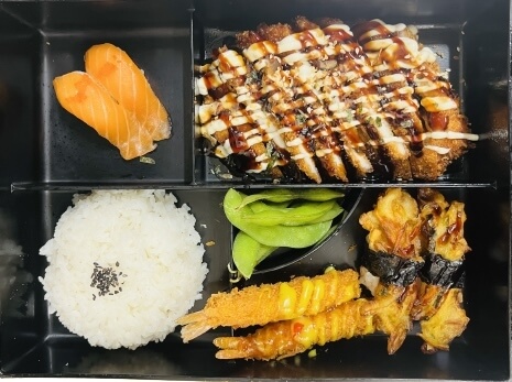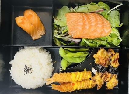 Vegetable nigiri 2pcs, Salmon nigiri 2pcs, plain rice, Tempura prawn 2pcs, edamame