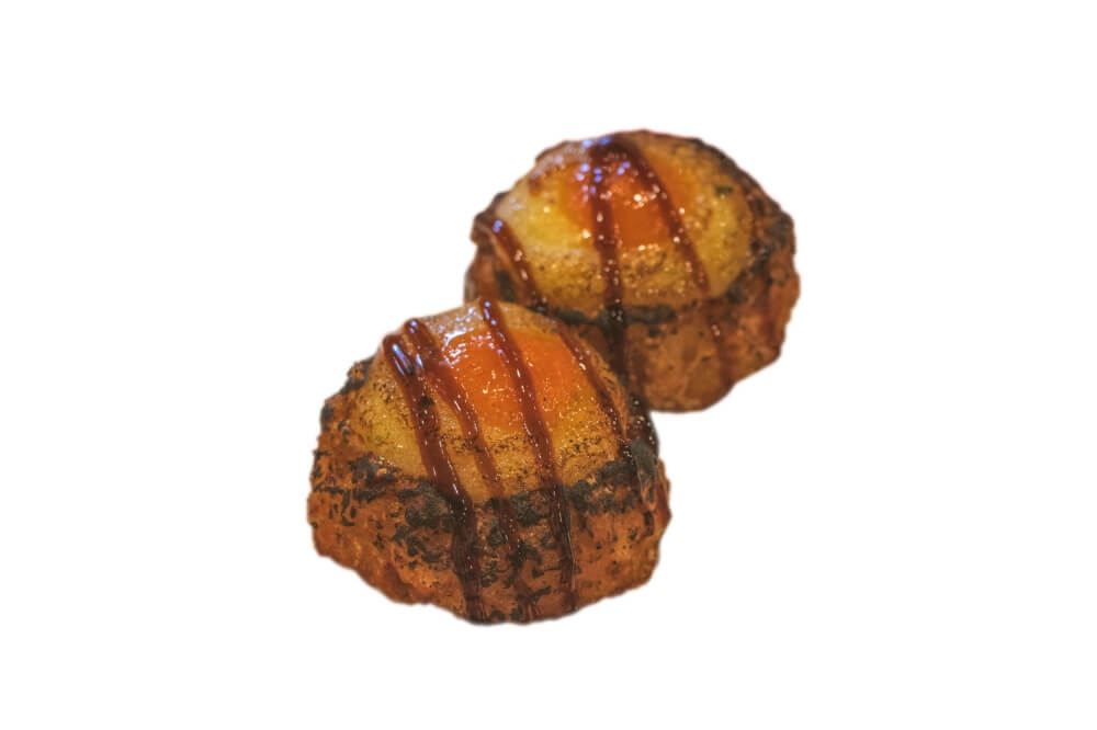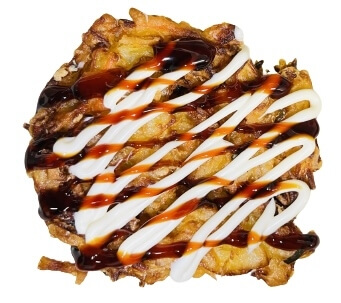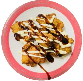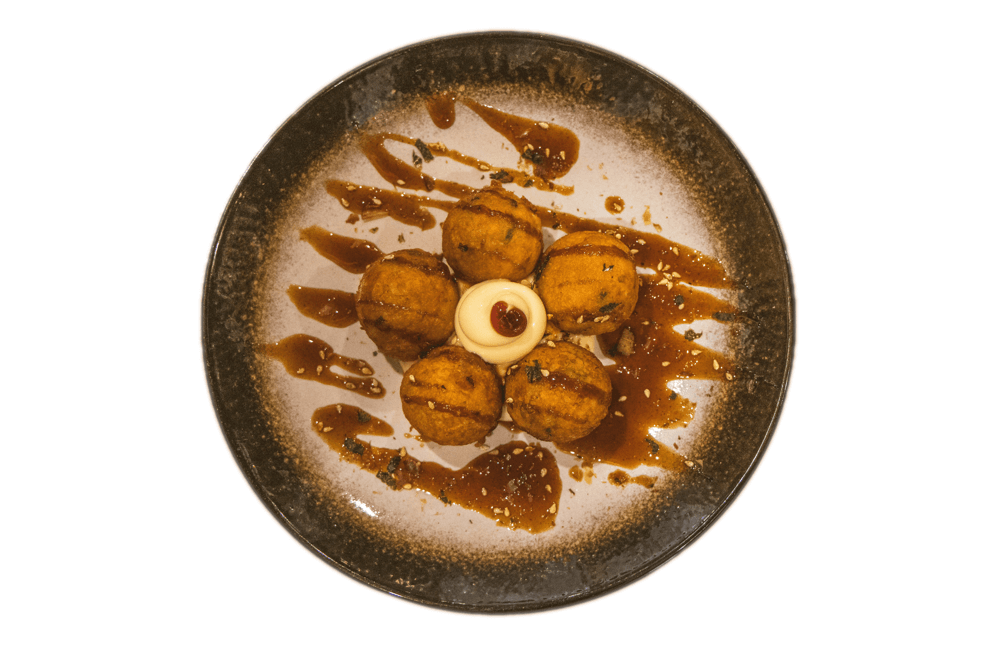 A ball shaped minced octopus deep fry with mayonnaise, katsu sauce