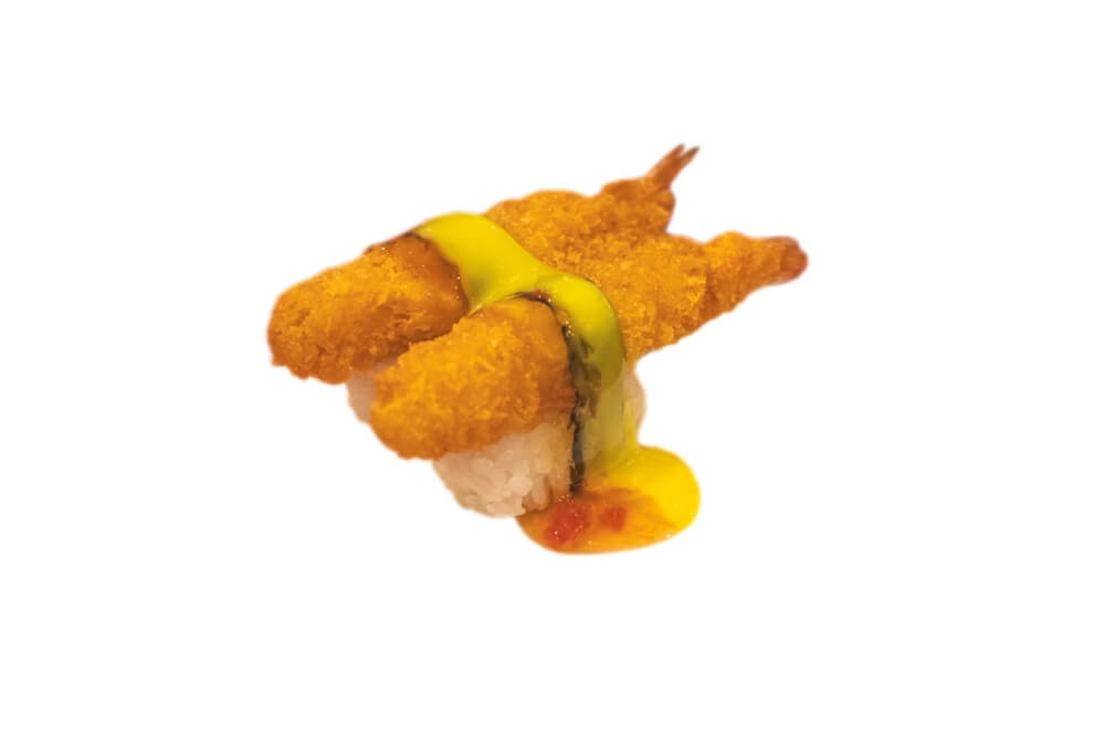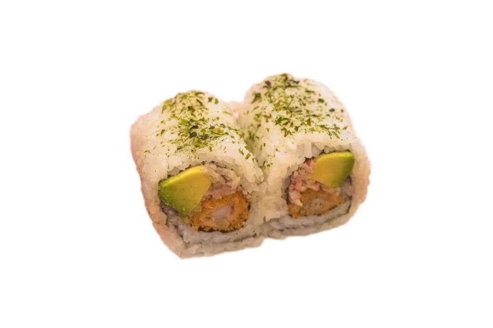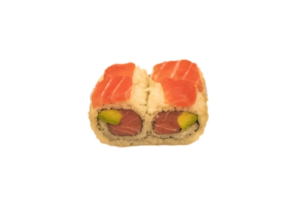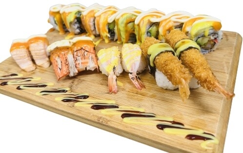 Rainbow roll 8pcs - prawn, crab and avocado topped with fresh prawn, salmon and avocado with sauce + Nigiri 8pcs - cooked salmon 2pcs, spicy prawn 2pcs, Tempura prawn 2pcs, spicy crab 2pcs