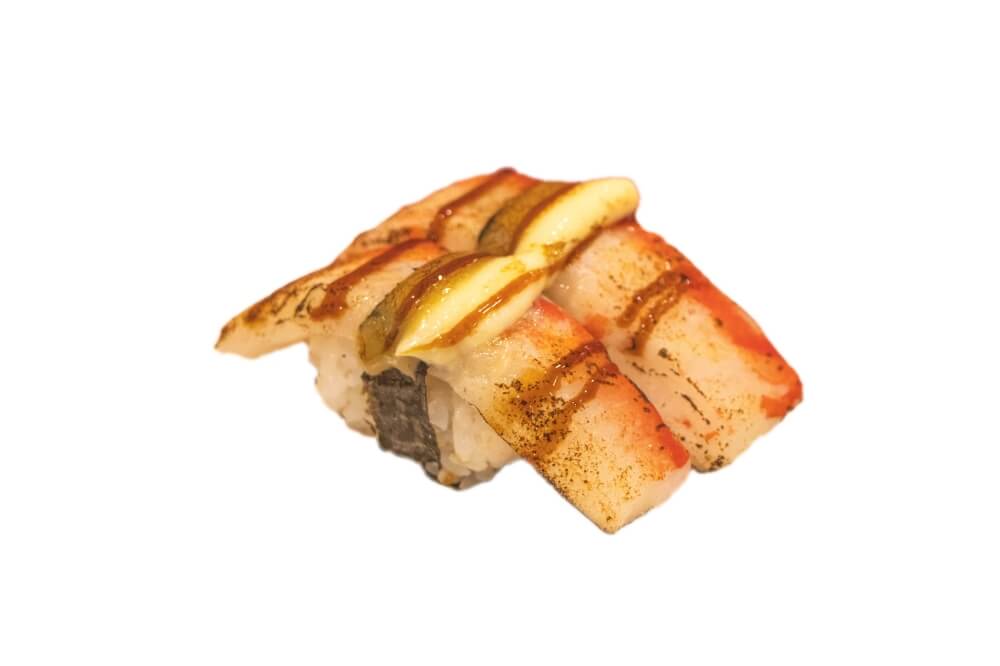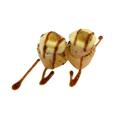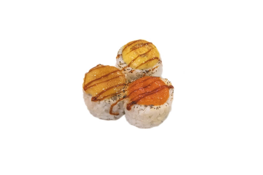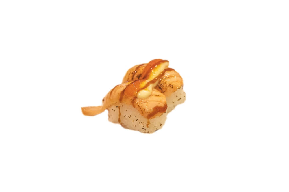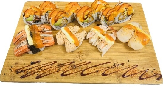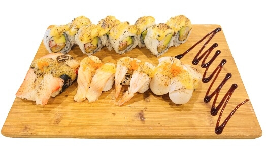 Cheese roll 8pcs - prawn, crab and avocado topped with scallop, cheese sauce + Nigiri 8pcs with cheese sauce - cooked salmon 2pcs, Tempura prawn 2pcs, scallop 2pcs, crab 2pcs