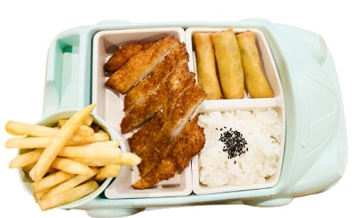 Japanese chicken schnitzel, chips, spring roll 3pcs, rice